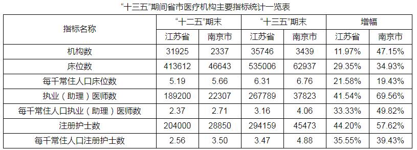 根据《南京市“十四五”卫生健康发展规划》要求,到2025年底,全市每千常住人口医疗机构床位数不低于8.4张,全市每千常住人口执业(助理)医师数、注册护士数分别达到5.5人和6.88人。按2025年底全市常住人口1000万测算,“十四五”期间,全市新增医疗机构床位数2.1万张,新增执业(助理)医师1.7万名、注册护士2.3万名。
